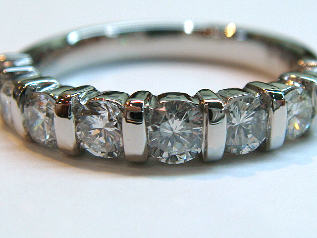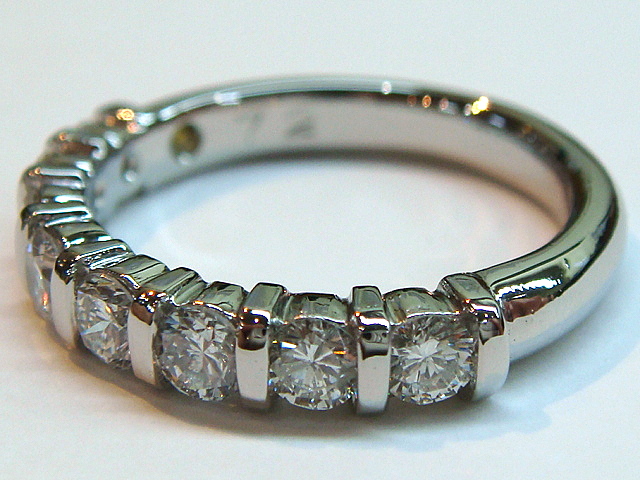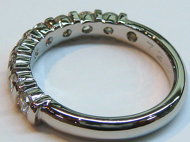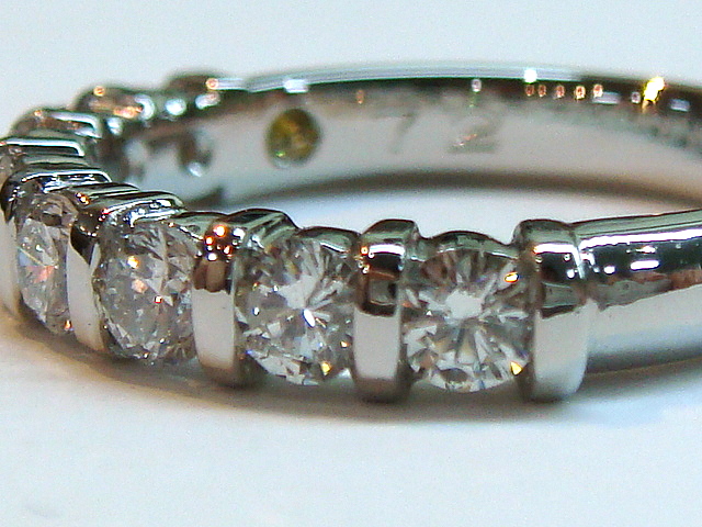 A-0176 Ptダイヤハーフエタニティリング お母様の一文字リングを使いやすく、今のデザインにとの事で一文字リングの石は5個でしたが、デザイン的に3個のダイヤを足して合計8pcs、070ctアップでオーダーメイドさせて頂きました。腕の内側に幸運のイエローダイヤを埋め込んでいます。