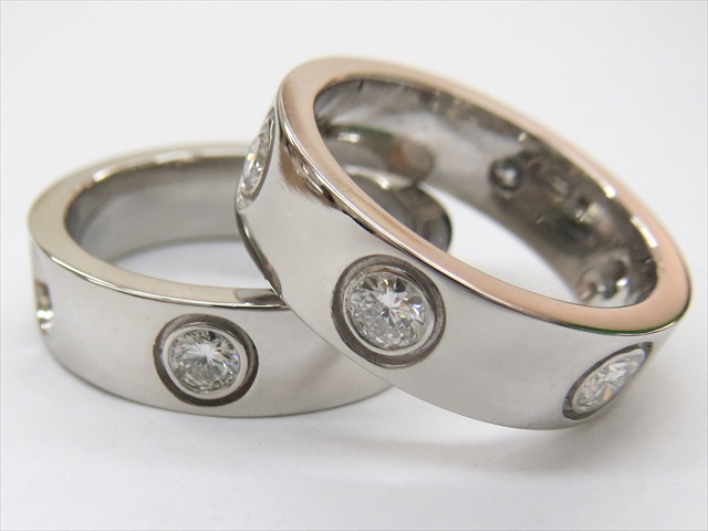 A-0097 Ptダイヤペアリング ご主人のリングにはダイヤを1pcs、奥様のリングにはダイヤを5pcs使用して、元の指輪のダイヤを全て使用して制作しています。奥様の最初のご希望のデザインは一文字リングでしたが、ご結婚10周年の記念として、ご主人と同じデザインのペアリングでお造りさせて頂きました。 ビフォー アフター