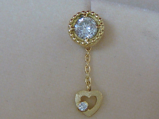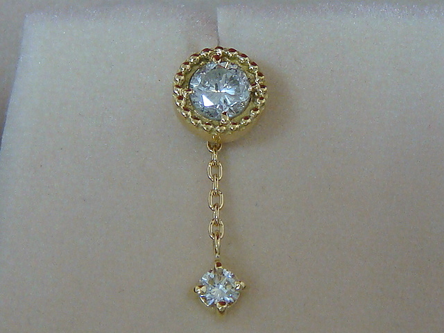 A-0111 K18ダイヤピアス 元はプラチナのシンプルな6本爪でしたが、カジュアルに使いたいとの事でK18ミル打ちの枠を製作してダイヤをセッティングしました。ぶら下げりパーツは取り外し可能で、左右でデザインが違う物をハンドメイドで製作しました。