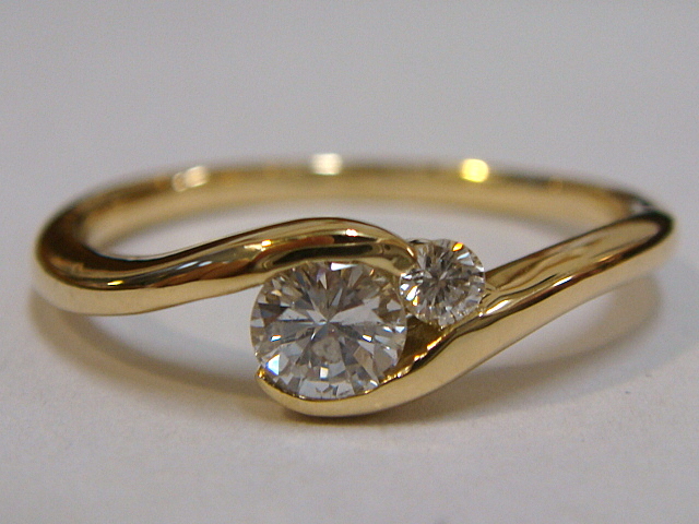 K18ダイヤ0.2ctリング 中石の横にラージメレを1pcsセッティングしたウェーブタイプで、爪の無い引っ掛かりの少ない使いやすいデザインになっています。ご不要になった古枠は下取り致しますのでお得にリフォームが出来ます。 ビフォー アフター