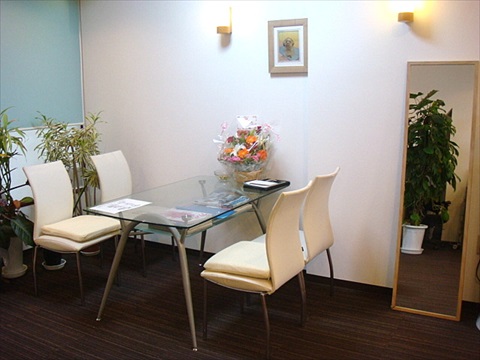 駐車後エレベーターを降りられて左に直進してください。オーエスドラッグとお肉屋さんを左折して右側にあります。